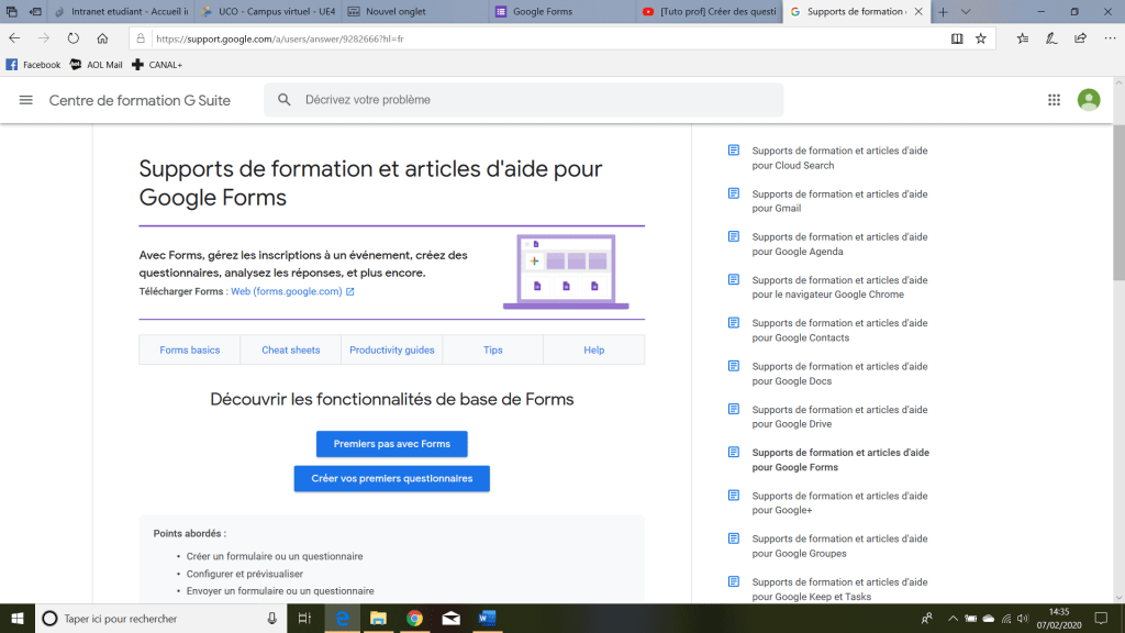 Voici le lien internet gratuit, donnant accès aux supports de formation et articles d’aide pour Google Forms : https://support.google.com/a/users/answer/9282666?hl=fr