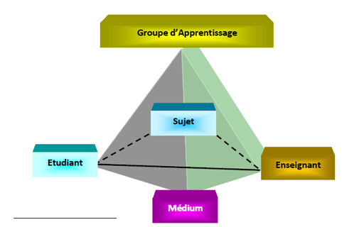 L’auteur fait référence aux apports d’Alain Jaillet qui « transforma le triangle pédagogique de Houssaye en tétraèdre centré (Jaillet 2004, p 196), ajoutant aux trois pôles le groupe d’apprentissage et le médium utilisé (environnement technologique), deux composantes essentielles en FOAD. »